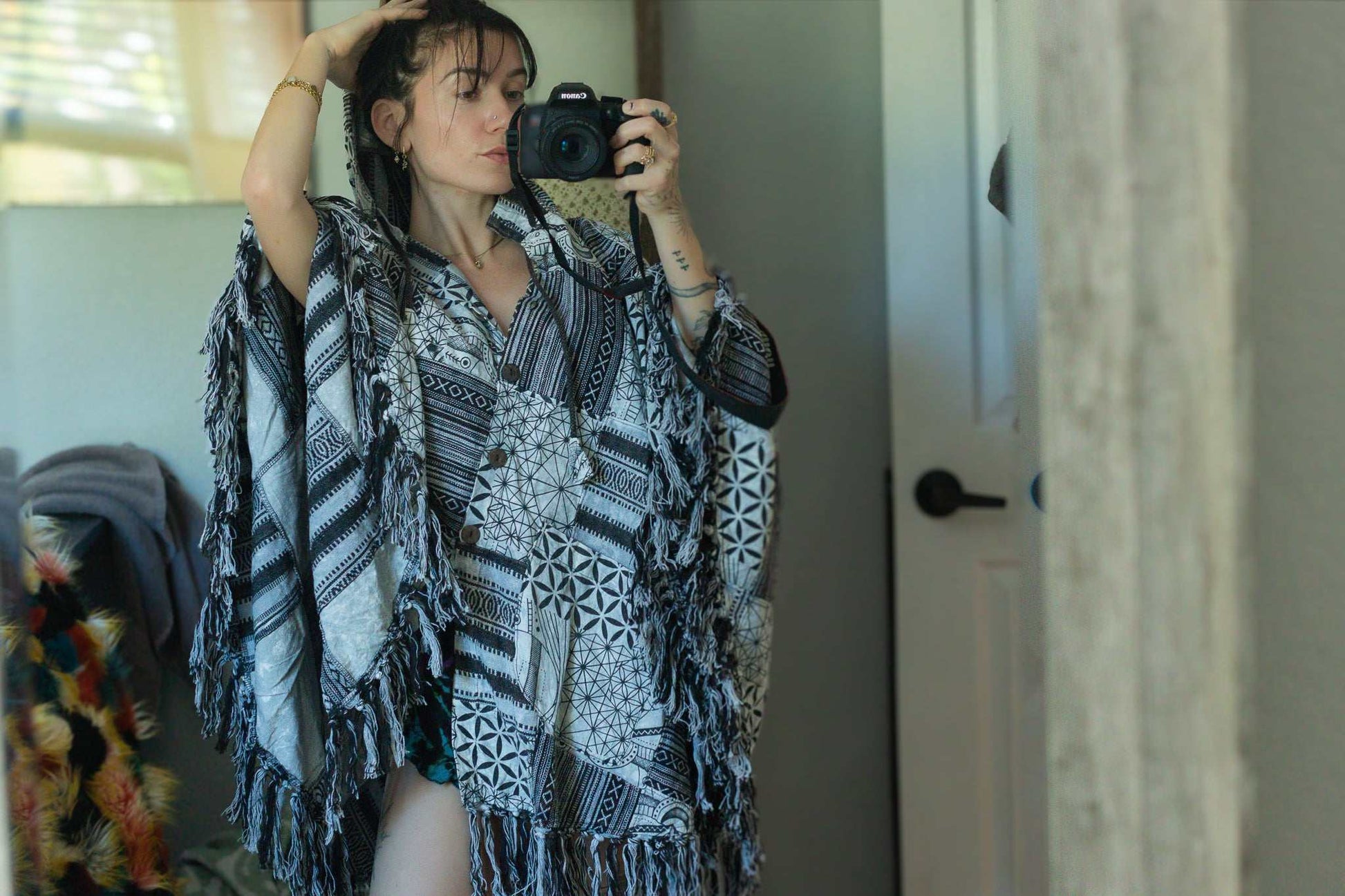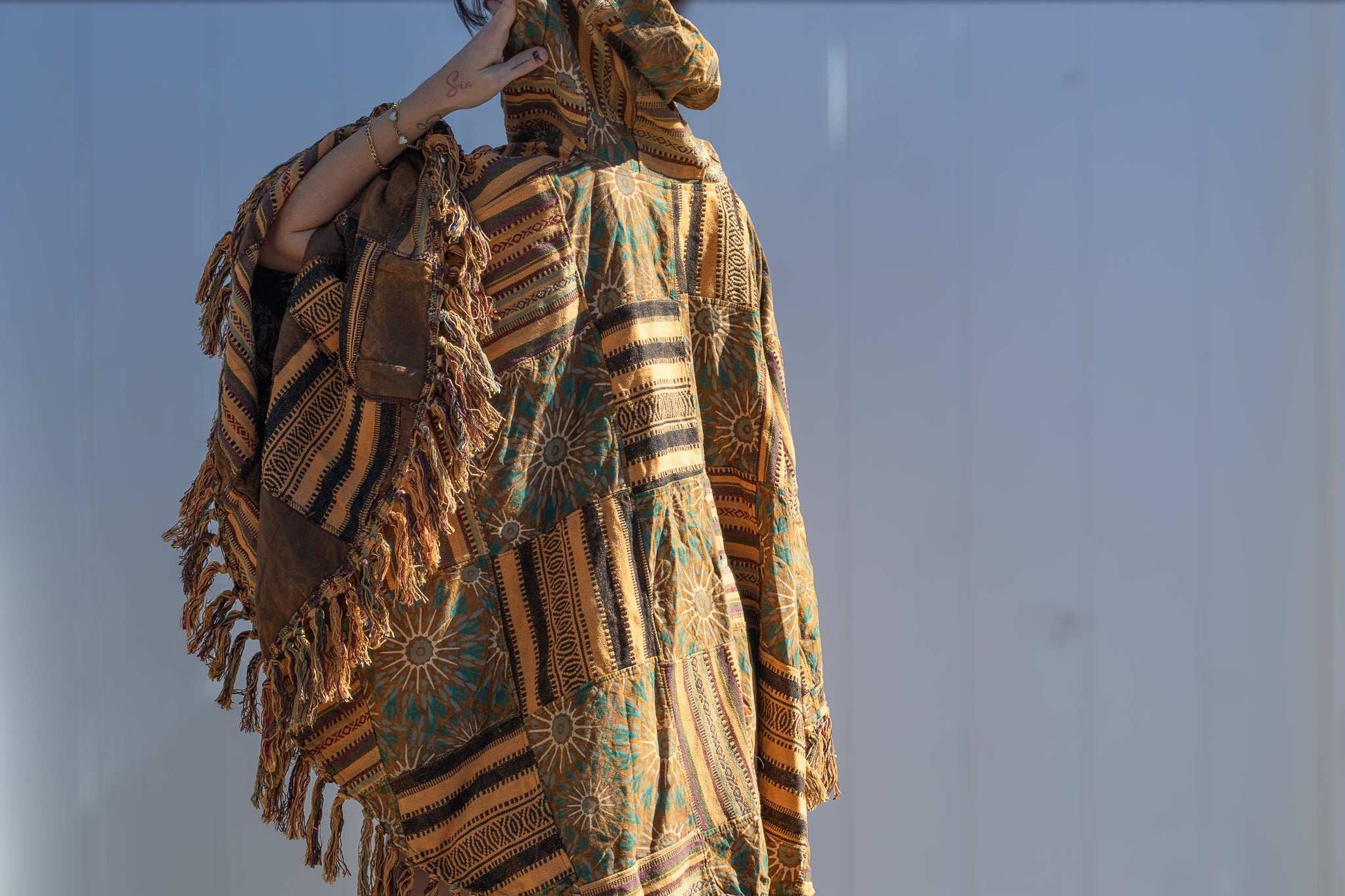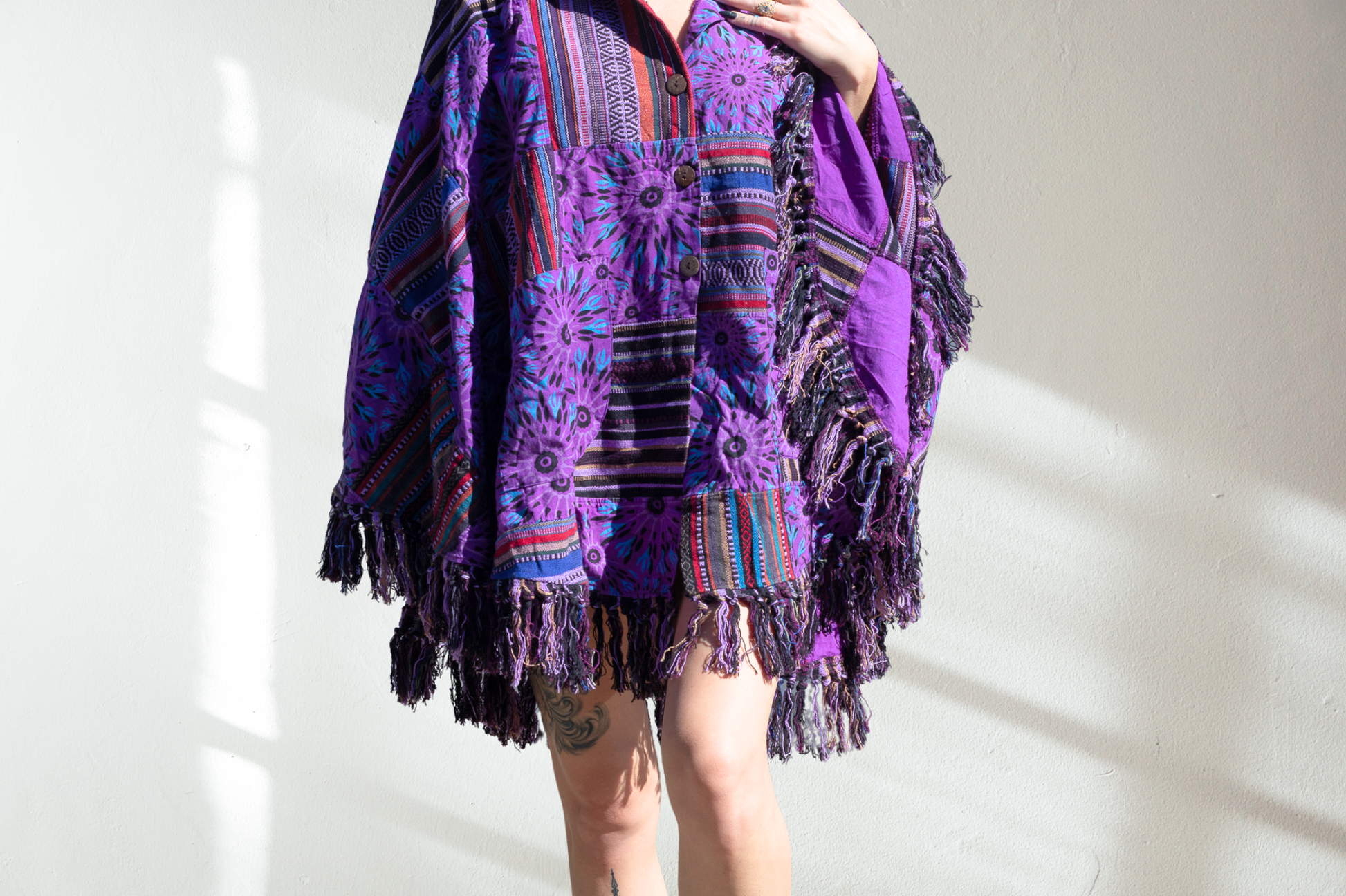The Himalaya fairtrade 100% cotton Patchwork Poncho is handmade in Nepal. Featuring unique wooden buttons and one size fits all , this poncho is the perfect addition to cover up and stay cozy, or unbutton and wear as an accessory (featuring a hood!).