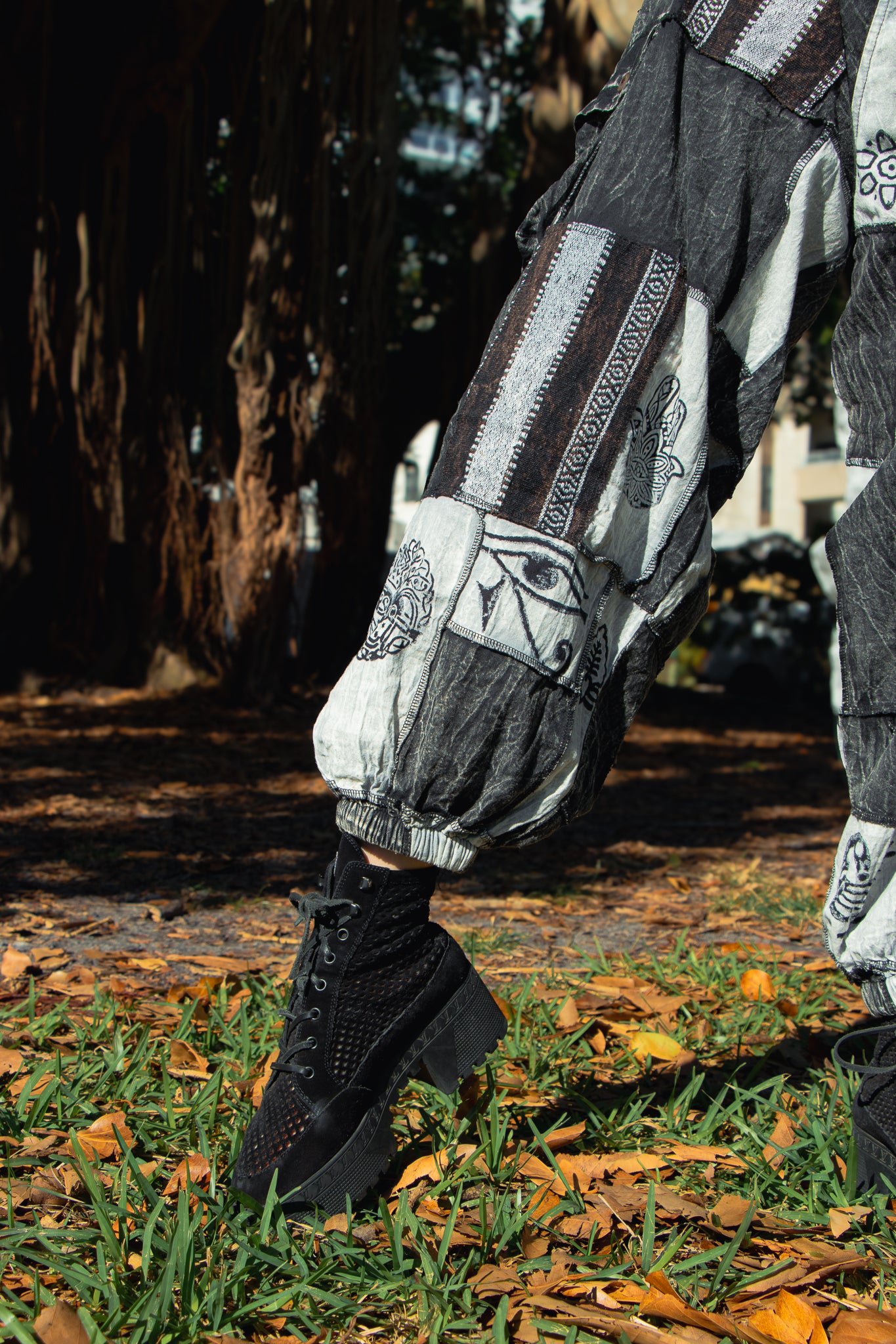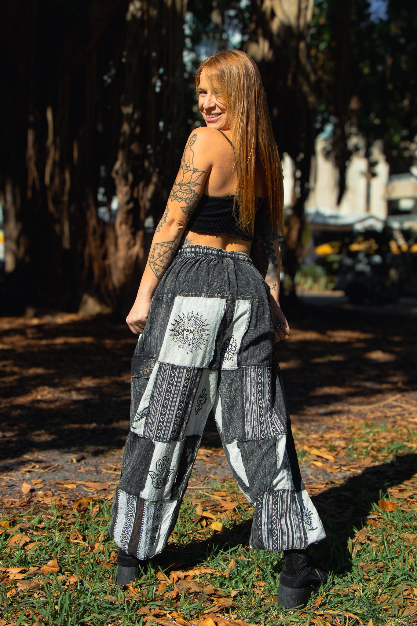 Comfort and style all in one with our Stone Washed Patchwork Harem Pants. Made from 100% fairtrade cotton, they feature a stretchy waistband with a tie for the perfect fit and elastic ankle bands for a secure feel. The unique patchwork design adds a playful twist to your wardrobe, making these pants a fun choice for everyday adventures or cozy lounging.